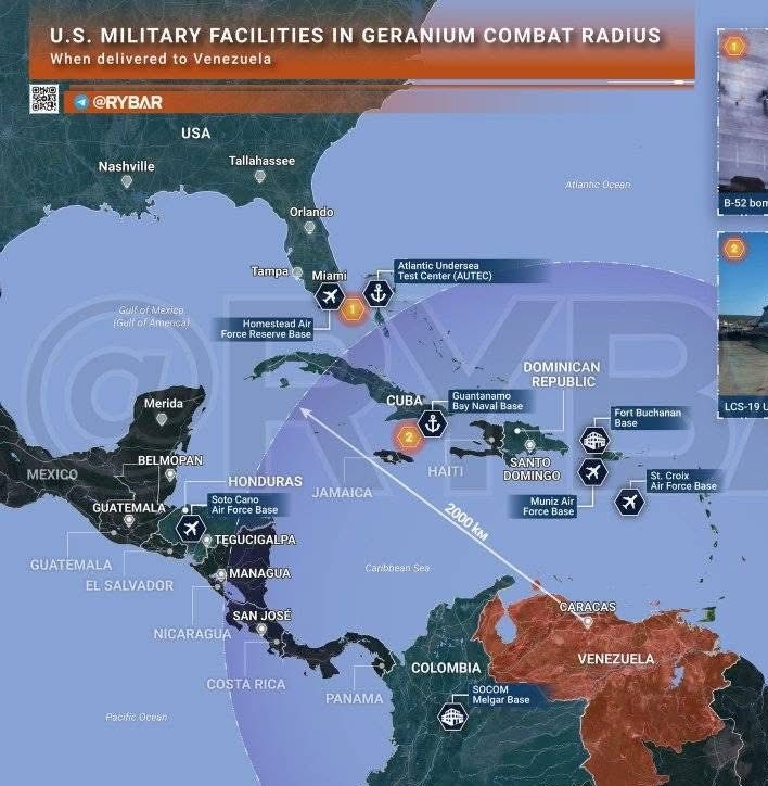 حتى تفهموا المعضلة التي تواجه الولايات المتحدة في حالة وصول المسيرة بأعداد كبيرة، فمدى 2000 كلم يجعلها قادرة على الوصول إلى قواعد مثل فورت بوكانان (Fort Buchanan) ومطار مونيز الجوي الوطني (Muñiz Air National Guard Base) في بورتوريكو، بالإضافة إلى محطة روزفلت رودز البحرية المعاد فتحها